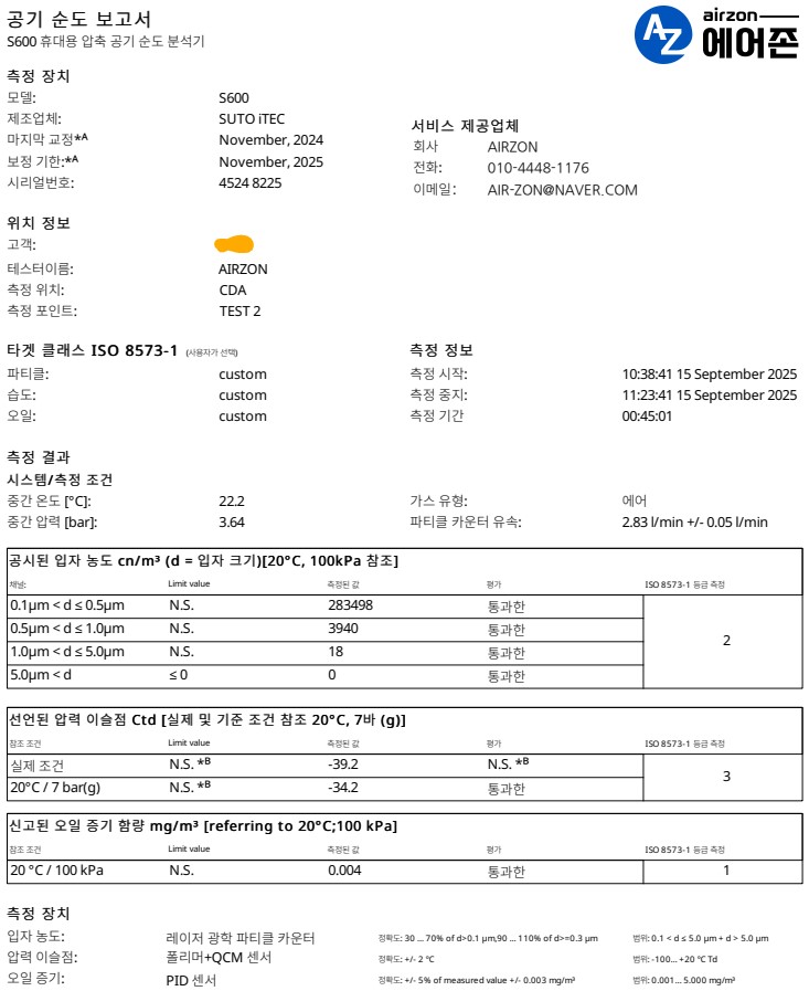 - 압축공기품질측정 시간은 전체1시간(실측정45분)정도 소요됩니다