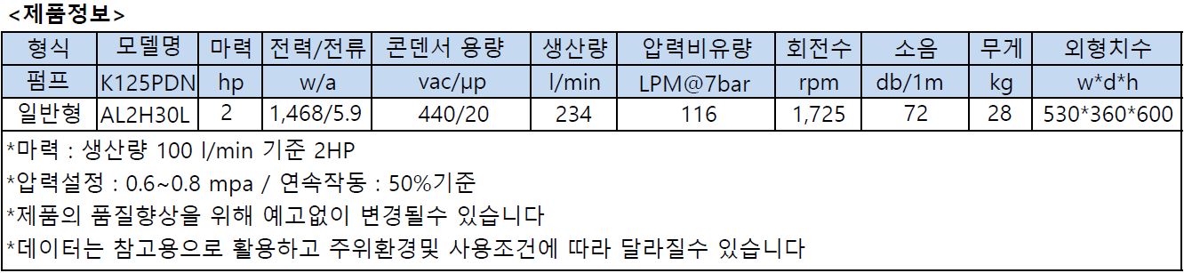 - 소형 국산펌프 저소음콤프레샤 K125PDN 2마력/알루미늄탱크30L 입니다